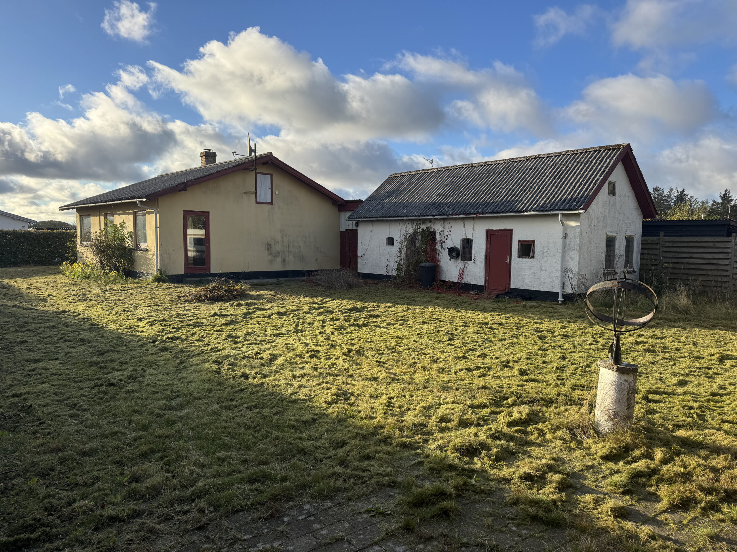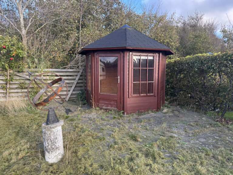 Bagved huset er en skøn baghave med flise terrasse og lille havehus i enden af haven.